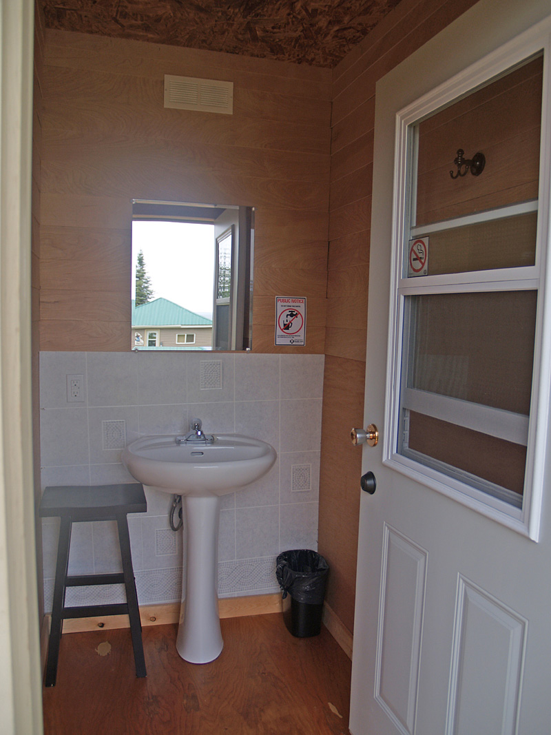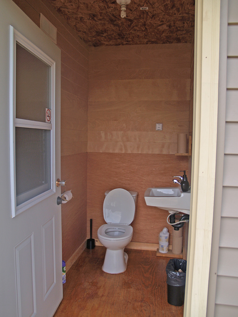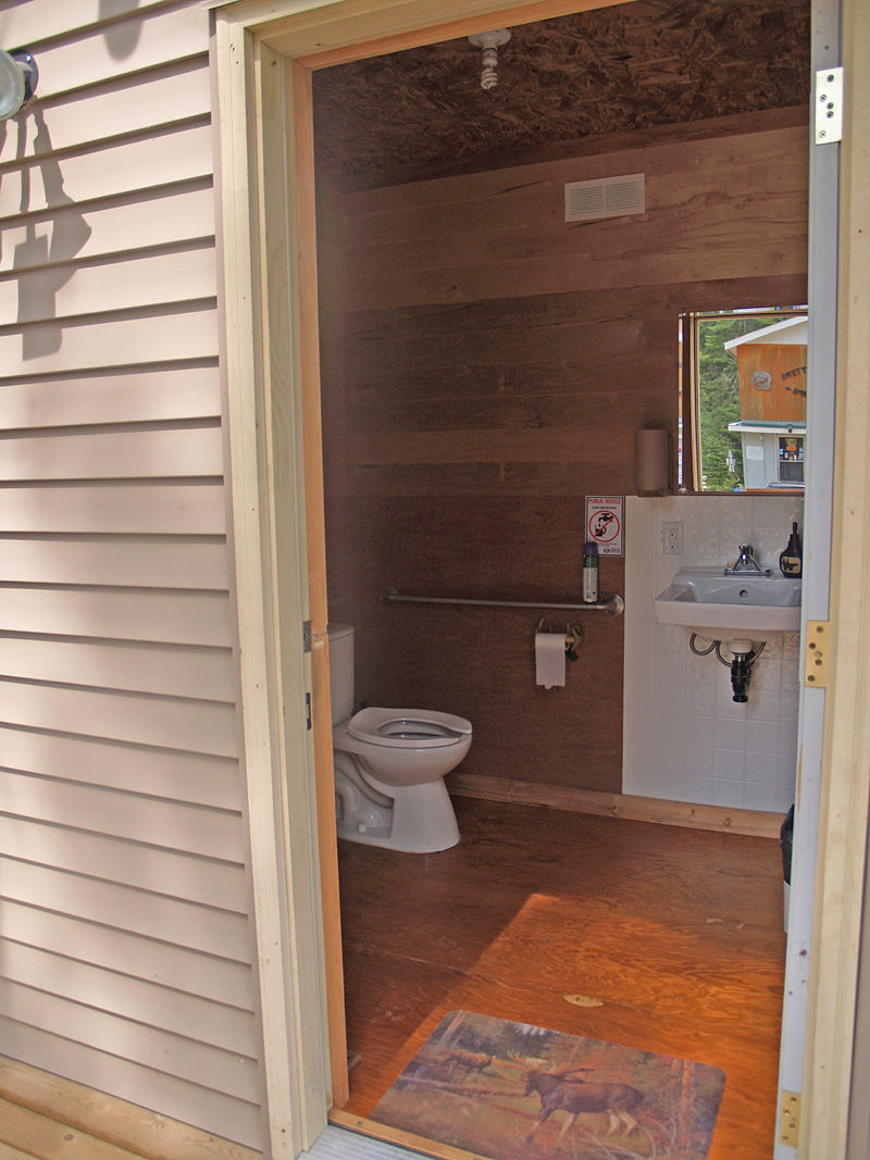 We have a centralized shower house with hot and cold running water. There are two sink rooms, three flush toilet rooms and three showers. The shower house is heated in the fall and has an easy access ramp for people with physical challenges.